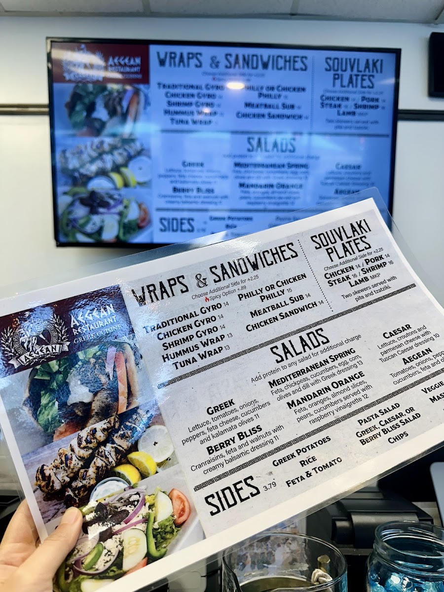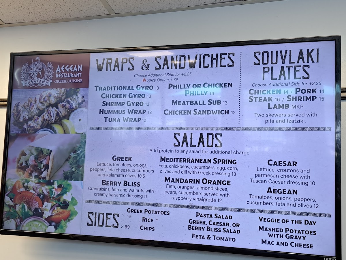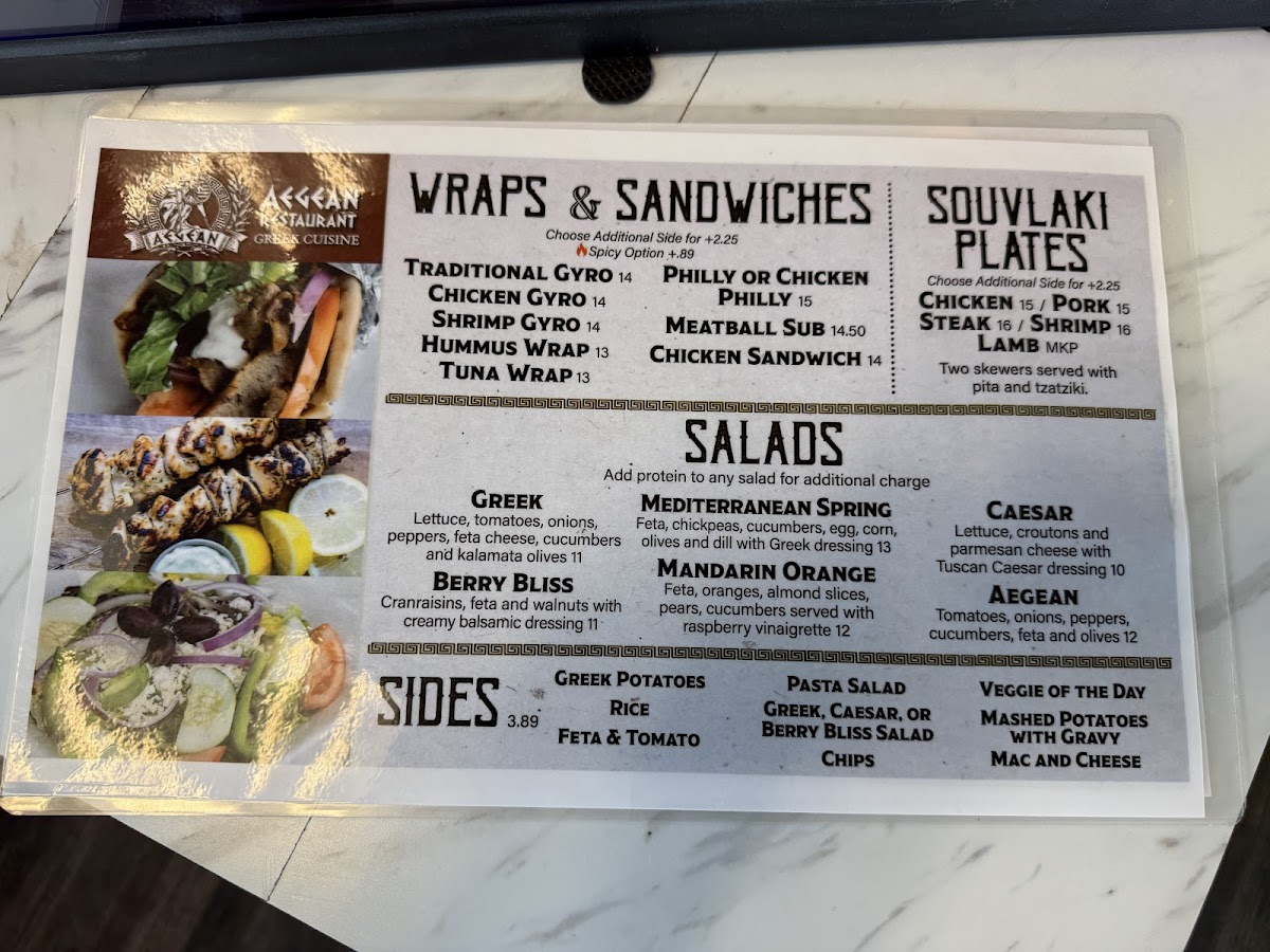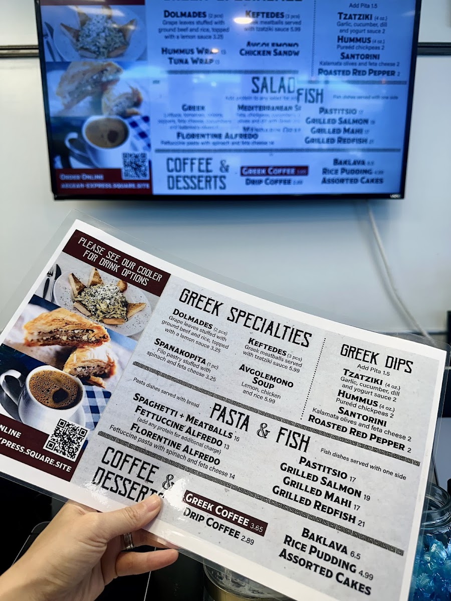 As a reviewer, I find the menu at Aegean Express to be a well-rounded reflection of Mediterranean comfort food with a clear Greek influence, offering something satisfying for every type of diner. The meal can begin lightly with fresh salads such as the Caesar Salad, Berry Bliss Salad, Mandarin Orange Salad, Aegean Salad, or the classic Greek Salad, each setting a refreshing tone. For simple beverages, the restaurant keeps it traditional with Greek Coffee and Drip Coffee. The heart of the menu shines in the Greek specialties, where flavorful starters like Roasted Red Pepper Dip, Santorini Dip, and Hummus Dip lead into hearty dishes such as Lamb Chops and the comforting Avgolemono Soup Bowl Specialty. Seafood lovers are well served with grilled options including Mahi Mahi, Salmon, and Redfish, all prepared to highlight natural flavors. The menu continues with filling plates like Lamb With 1 Side, Shrimp With 1 Side, Steak With 1 Side, Liver And Onions Platter, and Chicken Plate With 1 Side, while pasta fans can enjoy classics such as Pastichio, Fettucine Alfredo, Spaghetti And Meatballs, and Florentine Alfredo. Wraps like the Traditional Gyro Wrap With 1 Side, Chicken Gyro Wrap With 1 Side, Shrimp Gyro, Hummus Wrap With 1 Side, and Tuna Wrap With 1 Side offer convenient yet flavorful choices. Complementary sides, including Pasta Salad, Mashed Potatoes With Gravy, Side Of Greek Salad, Side Of Berry Bliss Salad, and Greek Potatoes, complete the experience, while desserts such as Tiramisu, Rice Pudding, Baklava, and Assorted Cakes provide a sweet and satisfying finish. Overall, the menu feels thoughtfully curated, generous, and true to its Mediterranean roots.